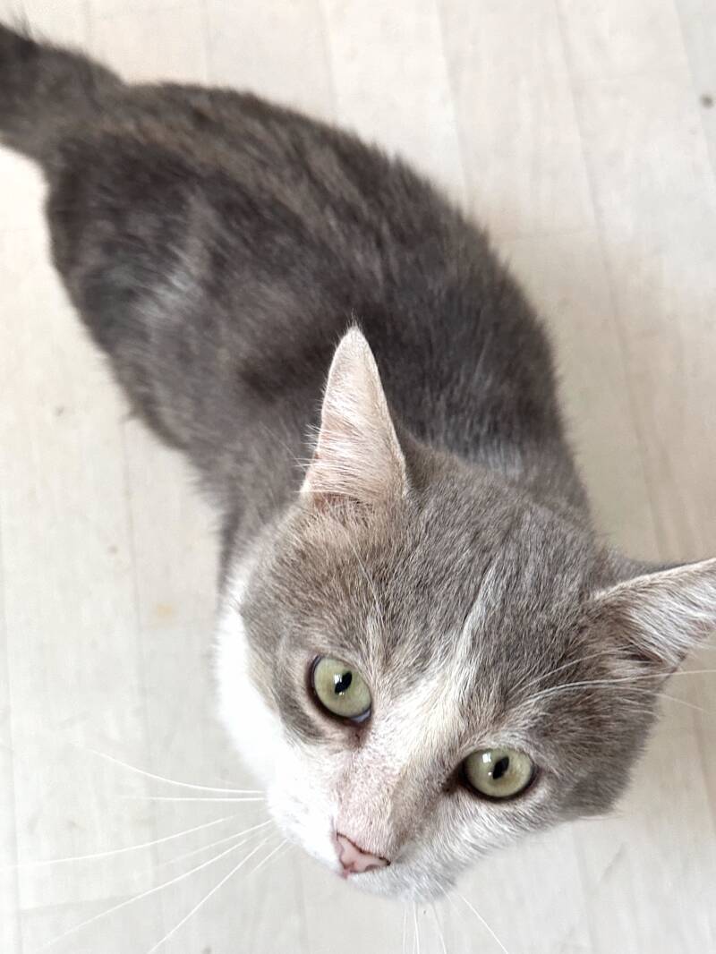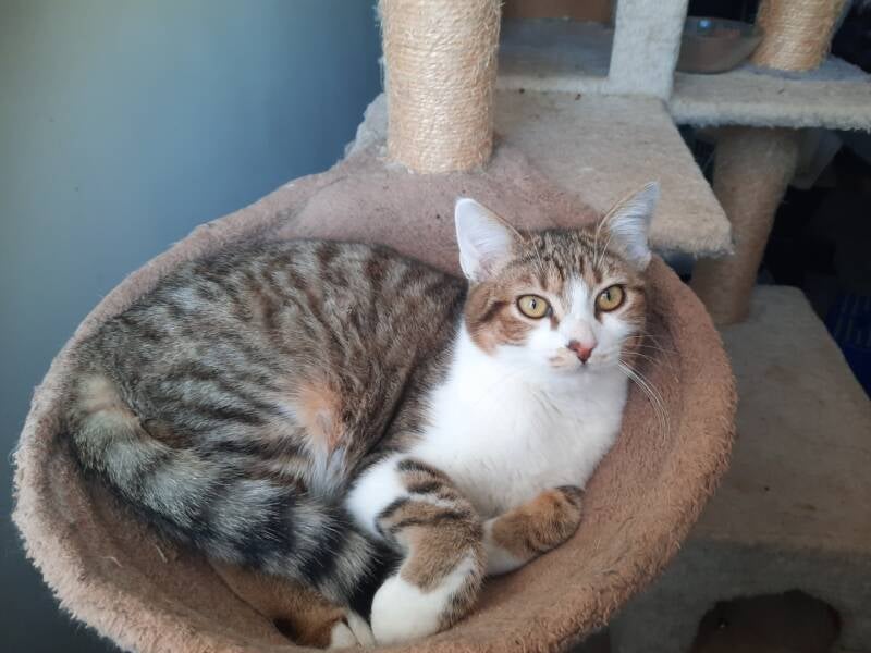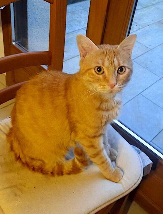 C'est un jeune chat curieux, aventurier et affectueux. Il se met sur ses 2 pattes arrières pour attirer l'attention et espérer recevoir des caresses. Il aime jouer et l'interaction avec les humains.