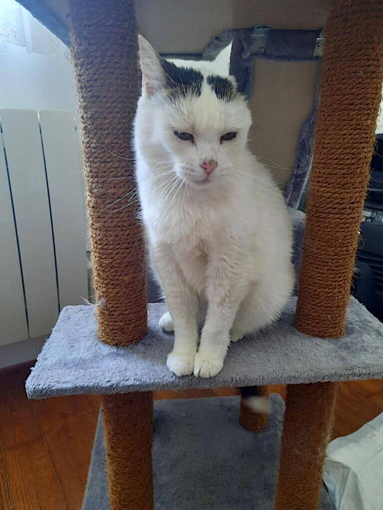 Voici Neige, femelle de 5 ans, présentée sur la page Bonne Action en raison de son cancer à son oreille gauche (soigné) et du fait qu'elle soit positive FIV (sida du chat)